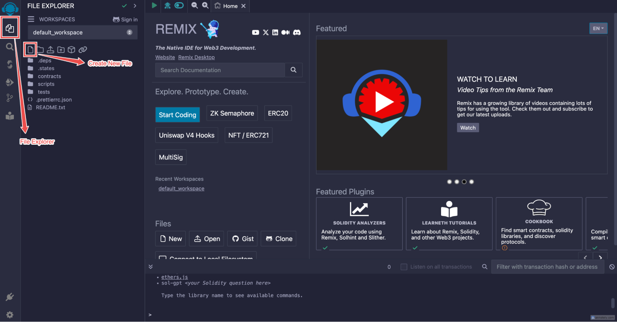 1. In the Remix IDE, navigate to the File Explorer (the first icon on the left sidebar).